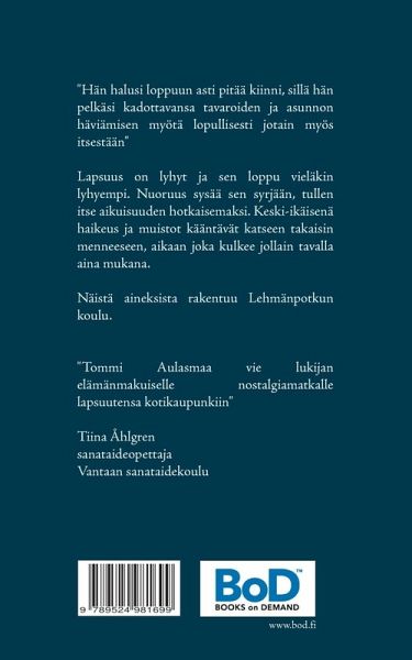 "Hän halusi loppuun asti pitää kiinni, sillä hän pelkäsi kadottavansa tavaroiden ja asunnon häviämisen myötä lopullisesti jotain myös itsestään" Lapsuus on lyhyt ja sen loppu vieläkin lyhyempi. Nuoruus sysää sen syrjään, tullen itse aikuisuuden hotkaisemaksi. Keski-ikäisenä haikeus ja muistot kääntävät katseen takaisin menneeseen, aikaan joka kulkee jollain tavalla aina mukana. Näistä aineksista rakentuu Lehmänpotkun koulu. "Tommi Aulasmaa vie lukijan elämänmakuiselle nostalgiamatkalle lapsuutensa kotikaupunkiin" Tiina Åhlgren sanataideopettaja Vantaan sanataidekoulu