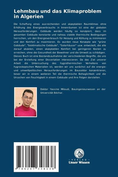 Die Schaffung eines ausreichenden und akzeptablen Raumklimas ohne Erhöhung des Energieverbrauchs in Innenräumen ist eine der globalen Herausforderungen. Gebäude werden häufig so konzipiert, dass im gesamten Gebäude konstante und nahezu stabile thermische Bedingungen herrschen, um den Energieverbrauch für Heizung und Kühlung zu minimieren und den Komfort zu maximieren. Es wurden neue Konzepte wie "grüne Gebäude", "bioklimatische Gebäude", "Solarhäuser" usw. entwickelt, die alle darauf abzielen, einen akzeptablen Komfort bei geringeren Kosten zu erreichen, ohne die Gesundheit der Bewohner und die Umwelt zu schädigen.Dieses Buch ist eine Bestandsaufnahme der verschiedenen Begriffe, die uns bei der Erstellung einer Dissertation interessieren. Da das Ziel unserer Arbeit die Untersuchung des hygrothermischen Verhaltens von hygroskopischen Materialien ist, werden wir uns zunächst auf die energie- und umweltpolitischen Herausforderungen im Bausektor konzentrieren, bevor wir in einem weiteren Teil die thermische Behaglichkeit und die Ursachen von Feuchtigkeit in einem Gebäude und ihre Folgen darstellen.
