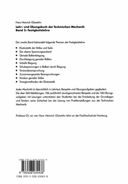 Mit dem Band zur Festigkeitslehre setzt der Autor sein Werk zur Technischen Mechanik fort. Folgende Themen aus der Festigkeitslehre werden in diesem Band behandelt: - Elastostatik der Stäbe und Seile - Der ebene Spannungszustand - Gerade Balkenbiegung - Durchbiegung gerader Balken - Schiefe Biegung - Schubspannung in Balken und Biegung - Torsionsbeanspruchung - Zusammengesetzte Beanspruchungen - Knicken gerader Stäbe - Energiemethoden der Elastostatik. Jeder Abschnitt beginnt mit einem Lehrtext, der die theoretischen Grundlagen kurz zusammenfaßt. Ausführliche und nachvollziehbar aufbereitete Beispiele folgen, die mit einer Auswahl von Übungsaufgaben abgeschlossen werden. Die Lösungen der Übungsaufgaben werden im Anhang angegeben. Mit 360 Abbildungen, 106 Übungsaufgaben mit Lösungen bietet der Band dem Studierenden breit gefächerte Hilfestellungen bei der Erarbeitung und Vertiefung der Grundlagen der Festigkeitslehre.