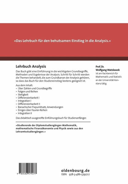 "Der Band enthält den üblichen Analysisstoff des 1. Studienjahrs, also insbesondere Differentiation und Integration von Funktionen zwischen ein- und mehrdimensionalen reellen Vektorräumen, bietet in der Darstellungsweise aber Besonderheiten. Subtile und ausführliche Erklärungen bereiten jeweils die abstrakten Ergebnisse vor, deutlich schon bei der axiomatischen Einführung der reellen Zahlen am Beginn. Empfehlenswert als Begleitlektüre für Studierende." EKZ-Informationsdienst (13/2007)
