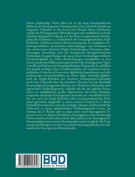 Dieses dreibändige Werk führt ein in die neue homöopathische Methode der Enneagramm-Homöopathie. Das Lehrbuch besteht aus insgesamt 3 Bänden. In den ersten zwei Bänden dieses Lehrbuches werden die 9 Enneagramm-Menschentypen sehr ausführlich und vielschichtig dargestellt in Bezug auf das ihnen entsprechende homöopathische Heilmittel, u.a. hinsichtlich der Grundeigenschaften, frühkindlichen Verhaltensmuster, Bewusstseinsgrade, Lernaufgaben, Beziehungsverhalten, dynamischen Entwicklungen vom bewussten in den unbewussten Zustand, Flügel, Verbindungen, Untertypen, Idealisierungen, Einteilung nach der Integrierten lösungsorientierten Psychologie, Entsprechungen der Jung'schen Terminologie, äußerem Erscheinungsbild etc. Diese Beschreibungen ermöglichen es dem Leser, eine genaue Differenzierung zwischen den Enneagramm-Typen zu treffen im Rahmen der homöopathischen Diagnostik. Es schließen sich jeweils wichtige Geist-/Gemütsrubriken der einzelnen homöopathischen Arzneien in Form einer alphabetisch geordneten und sehr umfassenden Arzneimittellehre an. Dann folgen ebenfalls alphabetisch die Single-Rubriken der einzelnen Enneagramm-Heilmittel sowie eine Übersicht über die einzelnen Themen und die Symbolik des jeweiligen Enneagramm-Mittels. Im 3. Band des Lehrbuches, dem eigentlichen Nachschlagewerk, schließt sich für die tägliche Praxisarbeit ein ausführliches großes Repertorium der Geist-/Gemütssymptome sämtlicher Enneagramm-Arzneien an. Anschließend finden wir auch die Single-Rubriken aller enneagrammatischen Heilmittel gesondert dargestellt in einem weiteren Kapitel im 3. Band. Schließlich werden hier auch die wichtigen Themen und Symbolik der Heilmittel in einem alphabetischen Nachschlagewerk vereint. Im Anhang des 3. Bandes gibt es dann noch einen Enneagramm-Typentest sowie ein kleines Bachblüten-Enneagramm. Das dreibändige Werk versteht sich als Lehrwerk für alle ernsthaft an der Enneagramm-Homöopathie interessierten Homöopathen und ermöglicht die Diagnostik und Therapie mit den 9 essentiellen homöopathischen Arzneimitteln der Enneagramm-Homöopathie.