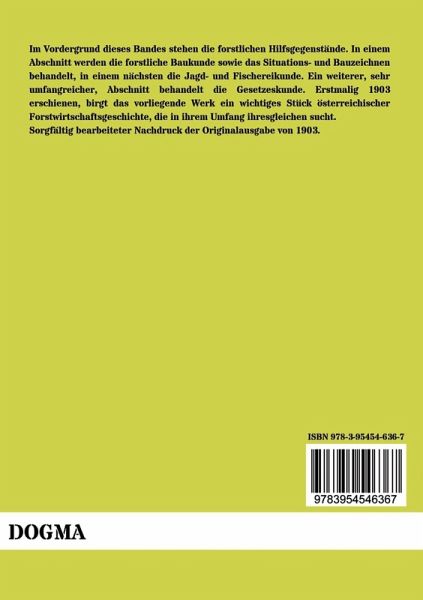 Im Vordergrund dieses Bandes stehen die forstlichen Hilfsgegenstände. In einem Abschnitt werden die forstliche Baukunde sowie das Situations- und Bauzeichnen behandelt, in einem nächsten die Jagd- und Fischereikunde. Ein weiterer, sehr umfangreicher, Abschnitt behandelt die Gesetzeskunde. Erstmalig 1903 erschienen, birgt das vorliegende Werk ein wichtiges Stück österreichischer Forstwirtschaftsgeschichte, die in ihrem Umfang ihresgleichen sucht.