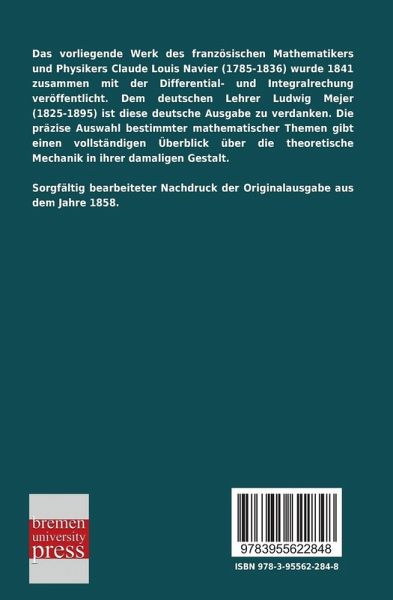 Das vorliegende Werk des französischen Mathematikers und Physikers Claude Louis Navier (1785-1836) wurde 1841 zusammen mit der Differential- und Integralrechung veröffentlicht. Dem deutschen Lehrer Ludwig Mejer (1825-1895) ist diese deutsche Ausgabe zu verdanken. Die präzise Auswahl bestimmter mathematischer Themen gibt einen vollständigen Überblick über die theoretische Mechanik in ihrer damaligen Gestalt.