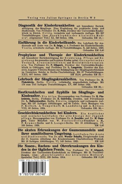 Erster Abschnitt Krankheiten der Neugeborenen.- Beginn des extrauterinen Lebens. Funktionelle Störungen in dieserPeriode.- Krankheiten in der Neugeborenenperiode.- Infektionskrankheiten bei Neugeborenen.- Zweiter Abschnitt Ernährung und Ernährungsstörungen.- Säuglingsernährung.- Ernährungsstörungen.- Ernährungsstörungen der Brustkinder.- Hypertrophische Pylorusstenose und Pylorospasmus.- Mangelkrankheiten.- Ernährungsstörungen und Magendarmkrankheiten älterer Kinder.- Dritter Abschnitt Allgemeinerkrankungen und Konstitutionsanomalien.- Krankheiten des Blutes.- Diathesen.- Erkrankungen der Schilddrüse.- Störungen des Körperaufbaues.- Vierter Abschnitt Infektionskrankheiten.- Allgemeines.- Scharlach (Scarlatina).- Das zweite Kranksein.- Masern (Morbilli).- Eöteln (Rubeola).- Erythema infectiosum.- Windpocken (Varieellae).- Impfung (Vakzination).- Diphtherie.- Serumkrankheit.- Mumps (Parotitis epidemica).- Keuchhusten (Pertussis).- Ruhr (Dysenterie).- Typhus abdominalis.- Akuter Gelenksrheumatismus.- Chronischer Gelenksrheumatismus.- Epidemische Grippe (Influenza).- Tuberkulose.- Skrofulöse.- Syphilis.- Fünfter Abschnitt Krankheiten der Respirationsorgane.- Diagnostische Bemerkungen.- Die grippösen Erkrankungen.- Erkrankungen der Nase und des Ohres.- Erkrankungen des Kehlkopfes, der Luftröhre und der Bronchien.- Lungenentzündungen.- Rippenfellentzündungen.- Sechster Abschnitt Krankheiten der Zirkulationsorgane.- Diagnostische Bemerkungen.- Angeborene Herzfehler.- Endocarditis.- Vitum cordis, Herzklappenfehler.- Myocarditis, Herzmuskel- und Kreislaufinsuffizienz.- Pericarditis.- Concretio cordis.- Siebenter Abschnitt Krankheiten der Verdauungsorgane.- Krankheiten des Mundes und des Rachens.- Krankheiten des Darmes.- Krankheiten der Leber.-Erkrankungen des Bauchfelles.- Tuberkulose der Abdominalorgane.- Achter Abschnitt Krankheiten der Harnorgane.- Diagnostische Bemerkungen.- Orthotische Albuminurie.- Zystopyelitis.- Enuresis.- Vulvovaginitis.- Epitheliale Verklebung, Balanitis, Phimose.- Die Nephropathien.- Neunter Abschnitt Krankheiten des Nervensystems.- Diagnostische Bemerkungen.- Erkrankungen der Hirnhäute.- Mißbildungen und Erkrankungen des Gehirnes und Rückenmarkes.- Familiär hereditäre Affektionen des Nervensystems.- Krampfkrankheiten.- Neurose des vegetativen Nervensystems (Akrodynie).- Neuropathie, Neurasthenie und Hysterie.- Zehnter Abschnitt Hautkrankheiten.- Ekzeme.- Urtikarielle Erkrankungen.- Polymorphe, exsudative Erytheme.- Pyodermien.- Zoonosen und Mykosen.- Hauttuberkulose.