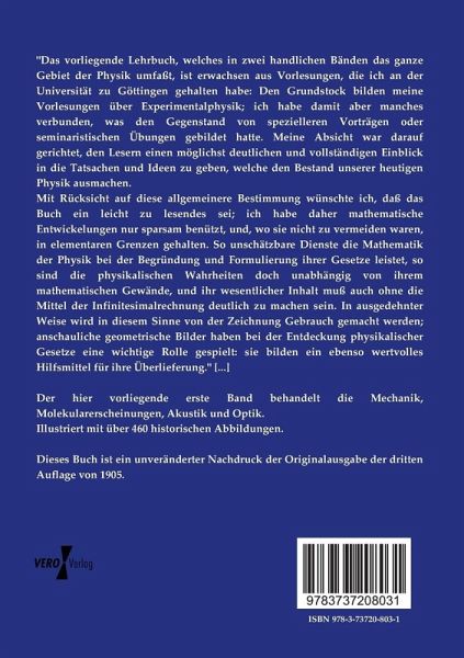 "Das vorliegende Lehrbuch, welches in zwei handlichen Bänden das ganze Gebiet der Physik umfaßt, ist erwachsen aus Vorlesungen, die ich an der Universität zu Göttingen gehalten habe: Den Grundstock bilden meine Vorlesungen über Experimentalphysik; ich habe damit aber manches verbunden, was den Gegenstand von spezielleren Vorträgen oder seminaristischen Übungen gebildet hatte. Meine Absicht war darauf gerichtet, den Lesern einen möglichst deutlichen und vollständigen Einblick in die Tatsachen und Ideen zu geben, welche den Bestand unserer heutigen Physik ausmachen.