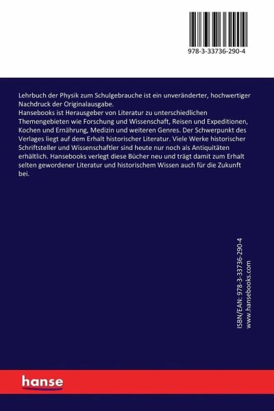 Lehrbuch der Physik zum Schulgebrauche ist ein unveränderter, hochwertiger Nachdruck der Originalausgabe.Hansebooks ist Herausgeber von Literatur zu unterschiedlichen Themengebieten wie Forschung und Wissenschaft, Reisen und Expeditionen, Kochen und Ernährung, Medizin und weiteren Genres. Der Schwerpunkt des Verlages liegt auf dem Erhalt historischer Literatur. Viele Werke historischer Schriftsteller und Wissenschaftler sind heute nur noch als Antiquitäten erhältlich. Hansebooks verlegt diese Bücher neu und trägt damit zum Erhalt selten gewordener Literatur und historischem Wissen auch für die Zukunft bei.