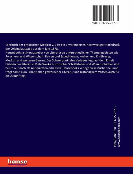 Lehrbuch der praktischen Medicin v. 2 ist ein unveränderter, hochwertiger Nachdruck der Originalausgabe aus dem Jahr 1878.Hansebooks ist Herausgeber von Literatur zu unterschiedlichen Themengebieten wie Forschung und Wissenschaft, Reisen und Expeditionen, Kochen und Ernährung, Medizin und weiteren Genres. Der Schwerpunkt des Verlages liegt auf dem Erhalt historischer Literatur. Viele Werke historischer Schriftsteller und Wissenschaftler sind heute nur noch als Antiquitäten erhältlich. Hansebooks verlegt diese Bücher neu und trägt damit zum Erhalt selten gewordener Literatur und historischem Wissen auch für die Zukunft bei.