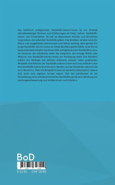 Das Lehrbuch erfolgreicher Nachhilfe-Lehrer/innen ist ein Produkt Jahrzehntelanger Studien und Erfahrungen als Vater, Lehrer, Nachhilfe-Lehrer und Firmenleiter. Es soll im Besonderen Schüler und Studenten ansprechen, die nebenher Nachhilfe geben. Das Büchlein ist aber auch für Eltern und ausgebildete Lehrerinnen und Lehrer wichtig. Aber gerade für junge Nachhilfe-Lehrer/innen ist dieses Büchlein geschrieben, da es für sie kaum Lehrmaterial gibt, das ihnen hilft, erfolgreich in der Nachhilfe zu sein. Im Zentrum des Lehrbuchs steht das Gespräch, das einzige Mittel oder Medium, das Nachhilfe-Lehrer/innen zur Verfügung steht. Das Büchlein erklärt die Methode des Aktiven Zuhörens anhand vieler praktischer Beispiele. Die Position der Nachhilfe-Lehrer/innen wird neu definiert: Aus dem Nachhilfe-Lehrer wird der Lern-Berater, aus der Nachhilfe-Lehrerin die Lern-Beraterin. Über die Beispiele hinaus ist das Buch so konzipiert, dass es sich auch zum eigenen Lernen eignet. Ziel des Lehrbuches ist die Vermittlung einer schülerorientierten Nachhilfe sprich Lern-Beratung zur Leistungsverbesserung von Schülerinnen und Schülern.