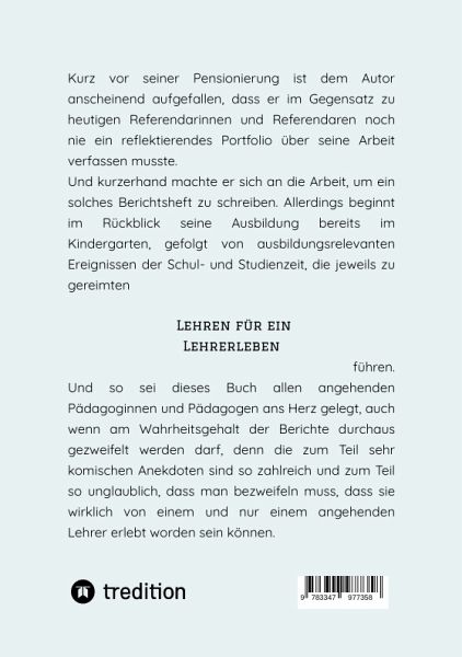 Der Werdegang des Autors zum Studienrat beginnt bereits im Kindergarten. Auch in Schule, Hochschule und im Privatleben lernt er frühzeitig wichtige Verhaltensweisen für seinen Traumberuf, die er uns im anekdotischen Rückblick auf seinen Werdegang in über 200 gereimten Maximen humorvoll aufbereitet hat. Das Buch enthält somit eine Fülle von Lehren, die jeder angehende Lehrer bedenken sollte. Darüber hinaus ist das Buch auch ein biographisch-zeitgeschichtliches Dokument für die 60er und 70er Jahres des vorigen Jahrhunderts.