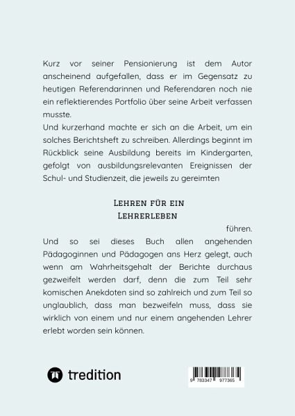 Der Werdegang des Autors zum Studienrat beginnt bereits im Kindergarten. Auch in Schule, Hochschule und im Privatleben lernt er frühzeitig wichtige Verhaltensweisen für seinen Traumberuf, die er uns im anekdotischen Rückblick auf seinen Werdegang in über 200 gereimten Maximen humorvoll aufbereitet hat. Das Buch enthält somit eine Fülle von Lehren, die jeder angehende Lehrer bedenken sollte. Darüber hinaus ist das Buch auch ein biographisch-zeitgeschichtliches Dokument für die 60er und 70er Jahres des vorigen Jahrhunderts.