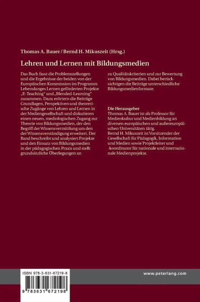 Das Buch fasst die Problemstellungen und die Ergebnisse der beiden von der Europäischen Kommission im Programm Lebenslanges Lernen geförderten Projekte «E-Teaching» und «Blended-Learning» zusammen. Dazu erörtern die Beiträge Grundlagen, Perspektiven und theoretische Zugänge von Lehren und Lernen in der Mediengesellschaft und diskutieren einen neuen, mediologischen Zugang zur Theorie von Bildungsmedien, der den Begriff der Wissensvermittlung um den der Wissensverständigung erweitert. Der Band beschreibt und analysiert Projekte und den Einsatz von Bildungsmedien in der pädagogischen Praxis und stellt grundsätzliche Überlegungen an zu Qualitätskriterien und zur Bewertung von Bildungsmedien. Dabei berücksichtigen die Beiträge unterschiedliche Bildungsmedienformate.