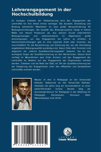 Im heutigen Zeitalter der Globalisierung wird das Engagement der Lehrkräfte für ihre Arbeit immer wichtiger. Die Auswahl, Einstellung und Bindung talentierter Mitarbeiter ist eine große Herausforderung für Bildungseinrichtungen. Die Qualität des Bildungssystems hängt in hohem Maße von diesen Prozessen ab. Aus diesem Grund unternehmen Bildungsmanager und -administratoren im Allgemeinen große Anstrengungen, um das Engagement der Lehrer zu erhöhen. In Hochschuleinrichtungen gibt es eine separate Zelle oder Gremien, die ausschließlich für die Bereicherung und Sicherung der von der Einrichtung angebotenen Bildungsqualität zuständig sind. Diese Zelle oder Gremien sind allgemein als "Interne Qualitätssicherungszelle" bekannt. Sie ist das wichtigste Organ der Qualitätssicherung an den Hochschulen. Dieses Buch verfolgt im Wesentlichen zwei Ziele: Erstens soll das Engagement der Lehrkräfte im Hinblick auf das Engagement der Organisation erörtert werden. Zweitens soll die Rolle der IQAC alsTeil der Qualitätssicherung bei der Steigerung des Engagements unter den effizienten und kompetenten Lehrkräften erörtert werden.