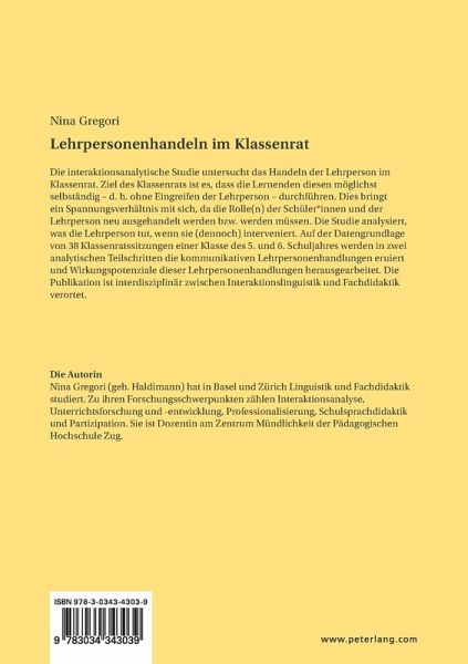 ein Spannungsverhältnis mit sich, da die Rolle(n) der Schüler_innen und der Lehrperson neu ausgehandelt werden bzw. werden müssen. Die Studie analysiert, was die Lehrperson tut, wenn sie (dennoch) interveniert. Auf der Datengrundlage von 38 Klassenratssitzungen einer Klasse des 5. und 6. Schuljahres werden in zwei analytischen Teilschritten die kommunikativen Lehrpersonenhandlungen eruiert und Wirkungspotenziale dieser Lehrpersonenhandlungen herausgearbeitet. Die Publikation ist interdisziplinär zwischen Interaktionslinguistik und Fachdidaktik verortet.