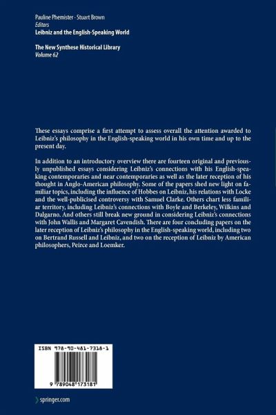 In addition to an introductory overview there are fourteen original and previously unpublished essays considering Leibniz's connections with his English-speaking contemporaries and near contemporaries as well as the later reception of his thought in Anglo-American philosophy. Some of the papers shed new light on familiar topics, including the influence of Hobbes on Leibniz, his relations with Locke and the well-publicised controversy with Samuel Clarke. Others chart less familiar territory, including Leibniz's connections with Boyle and Berkeley, Wilkins and Dalgarno. And others still break new ground in considering Leibniz's connections with John Wallis and Margaret Cavendish. There are four concluding papers on the later reception of Leibniz's philosophy in the English-speaking world, includingtwo on Bertrand Russell and Leibniz, and two on the reception of Leibniz by American philosophers, Peirce and Loemker.