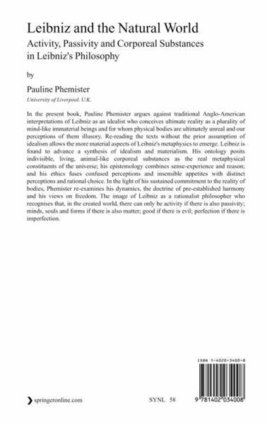 In the present book, Pauline Phemister argues against traditional Anglo-American interpretations of Leibniz as an idealist who conceives ultimate reality as a plurality of mind-like immaterial beings and for whom physical bodies are ultimately unreal and our perceptions of them illusory. Re-reading the texts without the prior assumption of idealism allows the more material aspects of Leibniz's metaphysics to emerge. Leibniz is found to advance a synthesis of idealism and materialism. His ontology posits indivisible, living, animal-like corporeal substances as the real metaphysical constituents of the universe; his epistemology combines sense-experience and reason; and his ethics fuses confused perceptions and insensible appetites with distinct perceptions and rational choice. In the light of his sustained commitment to the reality of bodies, Phemister re-examines his dynamics, the doctrine of pre-established harmony and his views on freedom. The image of Leibniz as a rationalist philosopher who values activity and reason over passivity and sense-experience is replaced by the one of a philosopher who recognises that, in the created world, there can only be activity if there is also passivity; minds, souls and forms if there is also matter; good if there is evil; perfection if there is imperfection.