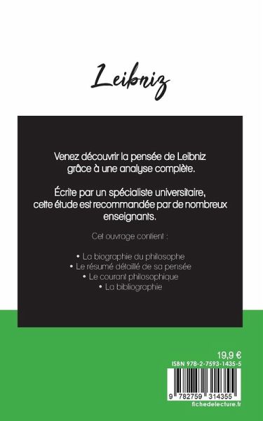 Venez découvrir la pensée de Leibniz grâce à une analyse philosophique de référence ! Écrite par un spécialiste universitaire, cette étude est recommandée par de nombreux enseignants. Cet ouvrage contient notamment la biographie du philosophe, le résumé détaillé de sa pensée, ainsi que l'analyse de son courant philosophique. Retrouvez tous nos titres sur : www.fichedelecture.fr.