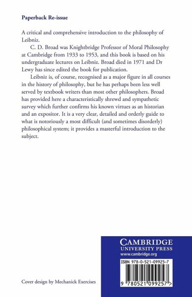 Broad's characteristically shrewd survey of Leibniz provides a very clear, detailed and orderly guide to a notoriously difficult philosophical system.