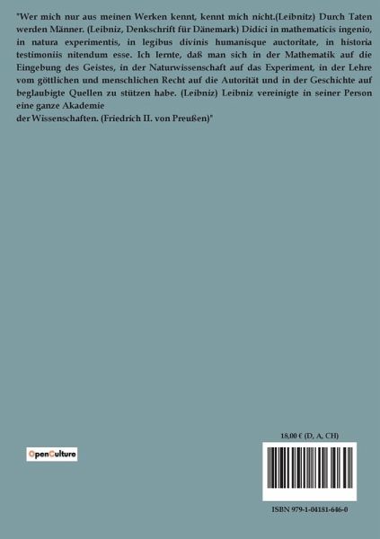 "Wer mich nur aus meinen Werken kennt, kennt mich nicht.(Leibnitz) Durch Taten werden Männer. (Leibniz, Denkschrift für Dänemark) Didici in mathematicis ingenio, in natura experimentis, in legibus divinis humanisque auctoritate, in historia testimoniis nitendum esse. Ich lernte, daß man sich in der Mathematik auf die Eingebung des Geistes, in der Naturwissenschaft auf das Experiment, in der Lehre vom göttlichen und menschlichen Recht auf die Autorität und in der Geschichte auf beglaubigte Quellen zu stützen habe. (Leibniz) Leibniz vereinigte in seiner Person eine ganze Akademie der Wissenschaften. (Friedrich II. von Preußen)"