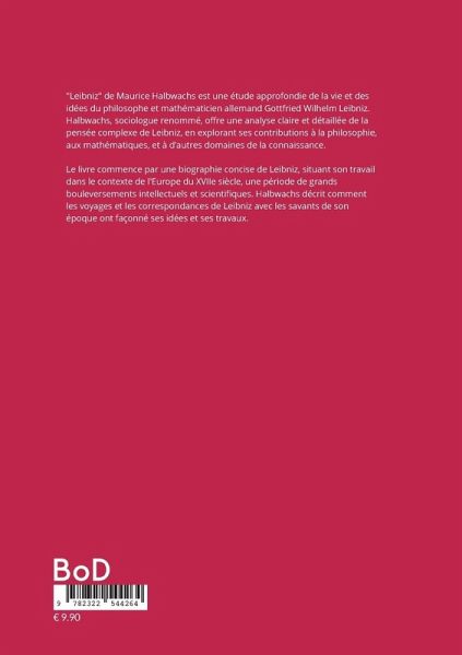 "Leibniz" de Maurice Halbwachs est une étude approfondie de la vie et des idées du philosophe et mathématicien allemand Gottfried Wilhelm Leibniz. Halbwachs, sociologue renommé, offre une analyse claire et détaillée de la pensée complexe de Leibniz, en explorant ses contributions à la philosophie, aux mathématiques, et à d'autres domaines de la connaissance. Le livre commence par une biographie concise de Leibniz, situant son travail dans le contexte de l'Europe du XVIIe siècle, une période de grands bouleversements intellectuels et scientifiques. Halbwachs décrit comment les voyages et les correspondances de Leibniz avec les savants de son époque ont façonné ses idées et ses travaux. Halbwachs explore ensuite les principales contributions de Leibniz à la philosophie, notamment son concept de la "monade", sa théorie de l'harmonie préétablie, et sa défense du principe de raison suffisante. Il explique comment ces idées ont influencé la métaphysique et ont établi des fondements pour la pensée philosophique moderne. Le livre traite également des contributions de Leibniz aux mathématiques, notamment son développement du calcul infinitésimal, parallèlement à Isaac Newton. Halbwachs détaille les implications de ces travaux et la fameuse querelle des calculs qui en a résulté. En outre, Halbwachs examine les idées de Leibniz sur la logique, la théologie, et les sciences naturelles, illustrant comment sa vision systématique de l'univers tentait de concilier science et spiritualité. Leibniz est présenté non seulement comme un penseur théorique, mais aussi comme un homme de pratique, impliqué dans des projets d'ingénierie, de diplomatie, et de réforme sociale. Le style de Halbwachs est rigoureux et pédagogique, rendant accessibles les concepts philosophiques et scientifiques complexes. Il s'efforce de montrer la cohérence et la modernité de la pensée de Leibniz, mettant en lumière son impact durable sur diverses disciplines.