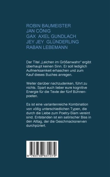 GAX Axel Gundlach: GAX, was nichts anderes als ein anagrammatisches Kürzel für Axel Gundlach ist, musste von Slammastern jahrelang zur Teilnehme überredet werden und ist seit dem Valentinstag 2014 heftigst in den Poetry Slam verliebt. In der Zeit seit dem PS Debüt sind über 40 Texte entstanden, unter dem andern welche, mit denen er schon bei seinem erst 11. Slam, den Hessenmeisterschaften, der Vizetitel errang. In dem Sammelband ist er mit einigen seiner besten Texte vertreten. Wer mehr will, findet hier bei BoD noch sein Solobuch "Sackkreisel auf Autopilot" mit 33 Poetry Slam und Kabaretttexten und vielen netten Zugaben. Wer noch mehr wissen will: unter www.gaxkabarett.de gibt es alles mögliche über den schreibenden Dutzendsassa zu erfahren. Raban Lebemann: Clemens Theodor Lachmalnich, der gerne unter dem Künstlernamen Raban Lebemann auftritt, ist unser Küken. Aber auch nur im Hinblick auf die Bühne. In seiner kurzen Zeit als Slammer hat der haar- aber keinesfalls humorlose Clemse schon fast alle großen Bühnen der Gegend gesehen, sich vieles von der Seele geschrieben und Erfahrungen gemacht. Das liest man auch in seinen Texten, die ganz nah an ihm dran sind. Und, zur Hölle, Clemse ist der beste Fahrer der Welt! Wer ist dieser Raban Lachmalnich? Wer diese Frage zu beantworten versucht ist wohl, ob der Komplexität ihrer Antwort, verdammt zu scheitern. Ein Mensch, der sich gerne Dinopflaster auf seine von der Glatzenrasur verwundete Platte kleben lässt. Ein Mensch, der einfach mal so mit zum National nach Dresden fährt und sich nachts im Schlaf verprügeln lässt (Sorry, war keine Absicht, ich habe sehr reale Träume!) . Ein Mensch: Texte zwischen Schwachsinn, Tiefsinn und Alltag. Das ist Raban Lebemann. Abschließend lässt sich nur sagen: Ich bin froh, nicht sein Rasierer zu sein. Alles Leben ist Leiden? Freund Buddha hatte nicht den Hauch einer Ahnung, wie man es als moderner Mann durch die Banalitäten des Alltags schaffen soll; so ohne das passende Bügeleisen für die Falten der Seele - und die der leider viel zu selten zerwühlten Bettwäsche. Zum Glück haben die Frauen und das Leben aber nicht nur Demütigung sondern auch Trost parat: in Form von Selbstironie, schweren Kalauern und deren tiefgründiger Auflösung. Am Schluss ist dann wieder: Alles in Buddha! "Alter, sind die alle Scheiße!", sagte Raban. "Dann mach es doch besser!", entgegnete ich. Und Raban zog es tatsächlich durch - sofort war er on fire und er ist es bis heute. Seine Texte schwanken zwischen hochgradiger Asozialität und einer gesunden Enttäuschung vom Leben. Sie lassen tief blicken in einen von Grund auf ehrlichen Menschen. In diesem Buch ist Raban Lebemann mit Abstand der Beste.