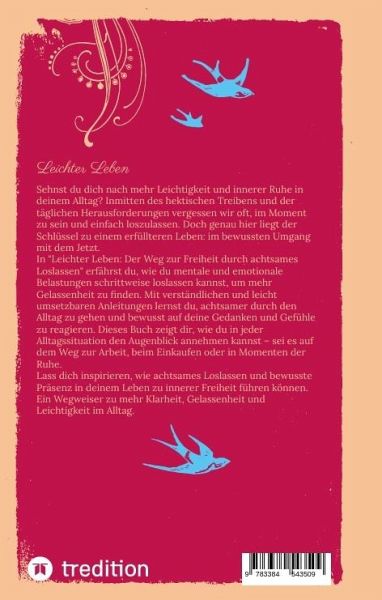 Sehnst du dich nach mehr Leichtigkeit und innerer Ruhe in deinem Alltag? Inmitten des hektischen Treibens und der täglichen Herausforderungen vergessen wir oft, im Moment zu sein und einfach loszulassen. Doch genau hier liegt der Schlüssel zu einem erfüllteren Leben: im bewussten Umgang mit dem Jetzt.In "Leichter Leben: Der Weg zur Freiheit durch achtsames Loslassen" erfährst du, wie du mentale und emotionale Belastungen schrittweise loslassen kannst, um mehr Gelassenheit zu finden. Mit verständlichen und leicht umsetzbaren Anleitungen lernst du, achtsamer durch den Alltag zu gehen und bewusst auf deine Gedanken und Gefühle zu reagieren. Dieses Buch zeigt dir, wie du in jeder Alltagssituation den Augenblick annehmen kannst - sei es auf dem Weg zur Arbeit, beim Einkaufen oder in Momenten der Ruhe.Lass dich inspirieren, wie achtsames Loslassen und bewusste Präsenz in deinem Leben zu innerer Freiheit führen können. Ein Wegweiser zu mehr Klarheit, Gelassenheit und Leichtigkeit im Alltag.