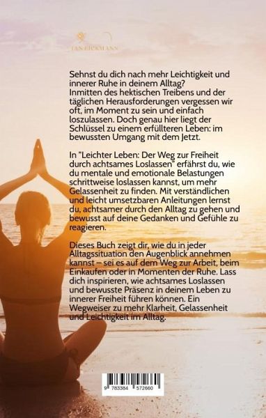 Sehnst du dich nach mehr Leichtigkeit und innerer Ruhe in deinem Alltag? Inmitten des hektischen Treibens und der täglichen Herausforderungen vergessen wir oft, im Moment zu sein und einfach loszulassen. Doch genau hier liegt der Schlüssel zu einem erfüllteren Leben: im bewussten Umgang mit dem Jetzt. In "Leichter Leben: Der Weg zur Freiheit durch achtsames Loslassen" erfährst du, wie du mentale und emotionale Belastungen schrittweise loslassen kannst, um mehr Gelassenheit zu finden. Mit verständlichen und leicht umsetzbaren Anleitungen lernst du, achtsamer durch den Alltag zu gehen und bewusst auf deine Gedanken und Gefühle zu reagieren. Dieses Buch zeigt dir, wie du in jeder Alltagssituation den Augenblick annehmen kannst - sei es auf dem Weg zur Arbeit, beim Einkaufen oder in Momenten der Ruhe. Lass dich inspirieren, wie achtsames Loslassen und bewusste Präsenz in deinem Leben zu innerer Freiheit führen können. Ein Wegweiser zu mehr Klarheit, Gelassenheit und Leichtigkeit im Alltag.Das Buch ist für alle, die sich nach einem entspannteren, bewussteren und erfüllteren Leben sehnen - und bereit sind, dafür die ersten Schritte zu gehen.