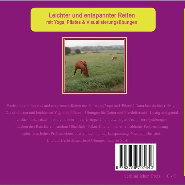Liebst du das Reiten so wie ich? Aber manchmal fehlt dir einfach die nötige Gelassenheit dazu, oder vielleicht drückt das ein oder andere reiterliche Problemchen? Dann hast du hier die süßeste und lustigste Lösung mit diesem Buch in der Hand. Lass dich nicht entmutigen - steige auf und reite los !! Mit super schönen Yoga- und Pilatesübungen zu einem neuen Körpergefühl für dich und dein Pferd.