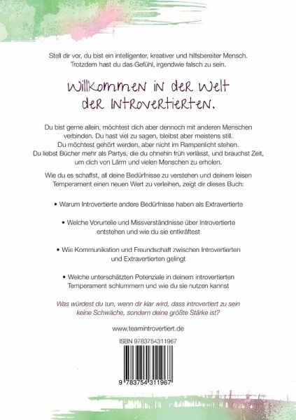 Stell dir vor, du bist ein intelligenter, kreativer und hilfsbereiter Mensch. Trotzdem hast du das Gefühl, irgendwie falsch zu sein.Willkommen in der Welt der Introvertierten.Du bist gerne allein, möchtest dich aber dennoch mit anderen Menschen verbinden. Du hast viel zu sagen, bleibst aber meistens still. Du möchtest gehört werden, aber nicht im Rampenlicht stehen. Du liebst Bücher mehr als Partys, die du ohnehin früh verlässt, und brauchst Zeit, um dich von Lärm und vielen Menschen zu erholen.Wie du es schaffst, all deine Bedürfnisse zu verstehen und deinem leisen Temperament einen neuen Wert zu verleihen, zeigt dir dieses Buch:- Warum Introvertierte andere Bedürfnisse haben als Extravertierte- Welche Vorurteile und Missverständnisse über Introvertierte entstehen und wie du sie entkräftest- Wie Kommunikation und Freundschaft zwischen Introvertierten und Extravertierten gelingt- Welche unterschätzten Potenziale in deinem introvertierten Temperament schlummern und wie du sie nutzen kannstWas würdest du tun, wenn dir klar wird, dass introvertiert zu sein keine Schwäche, sondern deine größte Stärke ist?