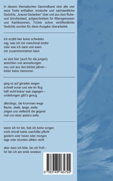 Dieser thematische Sammelband enthält eine Auswahl von Gedichten aus der Reihe KRAUSE GEDANKEN. Es sind sind auch viele neue Texte enthalten. Die Gedichte sind ironische und nachdenkliche Einsichten, Ansichten und Anmerkungen über und aus dem Ruhe- und Unruhestand, aufgeschrieben für Altersgenossen und Nachkommen. Früher schon veröffentlichte Gedichte wurden für diese Ausgabe überarbeitet.