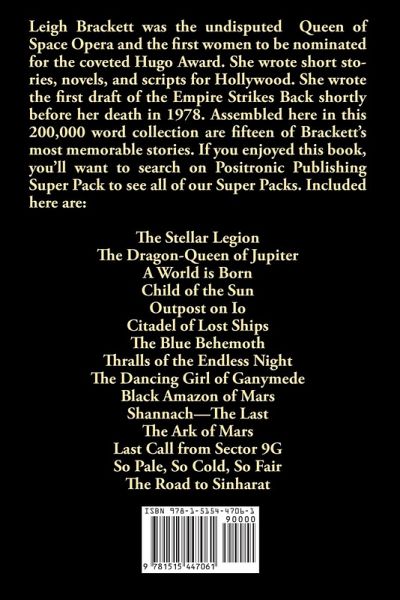 Leigh Brackett was the undisputed Queen of Space Opera and the first women to be nominated for the coveted Hugo Award. She wrote short stories, novels, and scripts for Hollywood. She wrote the first draft of the Empire Strikes Back shortly before her death in 1978. Assembled here in this 200,000 word collection are fifteen of Brackett's most memorable stories. If you enjoyed this book, you'll want to search on Positronic Publishing Super Pack to see all of our Super Packs. Included here are:The Stellar Legion The Dragon-Queen of Jupiter A World is Born Child of the Sun Outpost on Io Citadel of Lost Ships The Blue Behemoth Thralls of the Endless Night The Dancing Girl of Ganymede Black Amazon of Mars Shannach-The Last The Ark of Mars Last Call from Sector 9G So Pale, So Cold, So Fair The Road to Sinharat