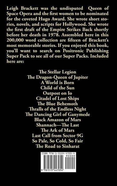 Leigh Brackett was the undisputed Queen of Space Opera and the first women to be nominated for the coveted Hugo Award. She wrote short stories, novels, and scripts for Hollywood. She wrote the first draft of the Empire Strikes Back shortly before her death in 1978. Assembled here in this 200,000 word collection are fifteen of Brackett’s most memorable stories. If you enjoyed this book, you’ll want to search on Positronic Publishing Super Pack to see all of our Super Packs. Included here are: The Stellar Legion The Dragon-Queen of Jupiter A World is Born Child of the Sun Outpost on Io Citadel of Lost Ships The Blue Behemoth Thralls of the Endless Night The Dancing Girl of Ganymede Black Amazon of Mars Shannach—The Last The Ark of Mars Last Call from Sector 9G So Pale, So Cold, So Fair The Road to Sinharat Thrill to 200,000 words of pulse pounding adventure by undisputed Queen of Space Opera!