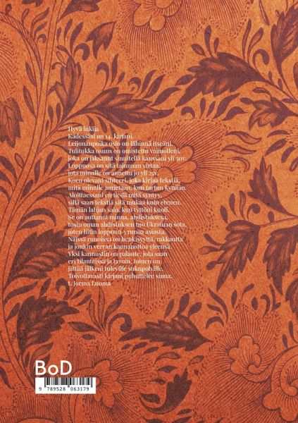 Hyvä lukija Kädessäsi on 14. kirjani. Leijonanpoika osio on lähinnä itseäni. Tulitukka osuus on omistettu vaimolleni, joka on jaksanut sinnitellä kanssani yli 50v. Loppuosa on sitä tajunnan virtaa, jota minulle on annettu jo yli 25v. tyttöni kuoleman jälkeen. Se on auttanut minua, ahdistuksesa, tosin oman ahdistuksen on tuonut raaka ja käsittämätön Ukrainan sota, joten liitin loppuun 3 runoa asiasta, miten koen tämän kaudeuden Yritin ottaa etäisyyttä raakuuksiin ja pohdin rehellisesti kysymystä, miksi? Päädyin yhteen mieheen ja hänen mieleensä. Herätys runossa siirryin avaruuteen, josta katsoen maapallo on näkymätön piste ja yhden ihmisen elämä on silmänräpäys. En löydä sanoja tälle hulluudelle, joka jo huomenna on historiaa. Toivottavasti kirjani puhuttelee sinua. t. Jorma Luoma