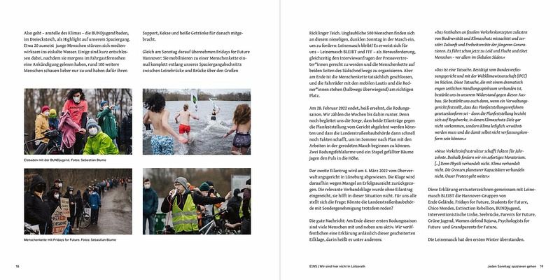 Seit 2021 mobilisieren wir als »Leinemasch BLEIBT« gegen eine Verkehrspolitik, die Klimagesetze und Grundrechte ignoriert. Unser Hotspot ist der Südschnellweg im Landschaftsschutzgebiet Leinemasch in Hannover, der für mehr Autoverkehr verbreitert werden soll. Zwei Rodungswinter haben wir in der Masch verbracht und die Waldbesetzung »Tümpeltown« unterstützt. Im Januar 2024 wurde die Besetzung geräumt und ein großer Teil der Bäume gefällt.Mit Texten und Bildern erzählen wir gemeinsam vom Kampf gegen das unerträgliche Weiter-so in der Leinemasch und anderswo. Wir zeigen, was verloren ist und was es zu gewinnen gibt.