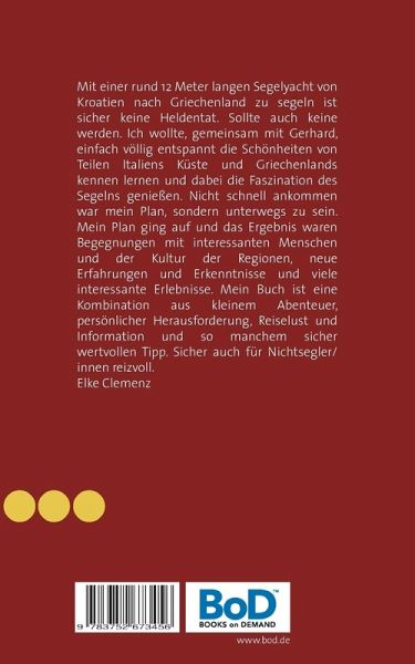 Mit einer rund 12 Meter langen Segelyacht von Kroatien nach Griechenland zu segeln ist sicher keine Heldentat. Sollte auch keine werden. Ich wollte, gemeinsam mit Gerhard, einfach völlig entspannt die Schönheiten von Teilen Italiens Küste und Griechenlands kennen lernen und dabei die Faszination des Segelns genießen. Nicht schnell ankommen war mein Plan, sondern unterwegs sein. Mein Plan ging auf und das Ergebnis waren Begegnungen mit interessanten Menschen und der Kultur der Regionen, neue Erfahrungen und Erkenntnisse und viele interessante Erlebnisse. Mein Buch ist eine Kombination aus kleinem Abenteuer, persönlicher Herausforderung, Reiselust und Information und so manchem wertvollen Tipp. Sicher auch eine reizvolle Lektüre für Nichtsegler/innen. Diese 3. Auflage enthält alle Erlebnisse der bisherigen und der aktuellen Reise.Elke Clemenz