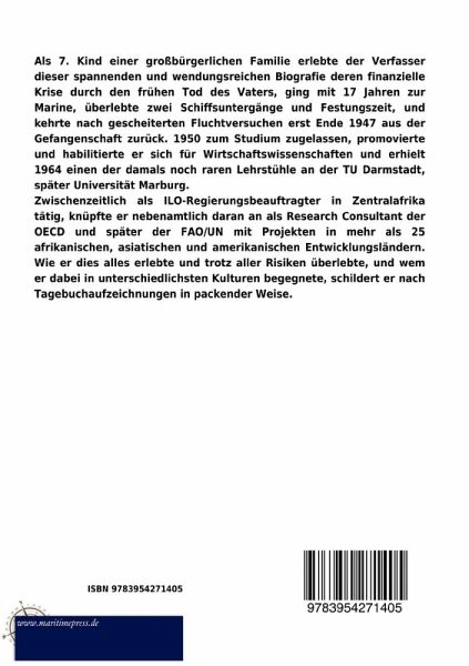 Als 7. Kind einer großbürgerlichen Familie erlebte der Verfasser dieser spannenden und wendungsreichen Biografie deren finanzielle Krise durch den frühen Tod des Vaters, ging mit 17 Jahren zur Marine, überlebte zwei Schiffsuntergänge und Festungszeit, und kehrte nach gescheiterten Fluchtversuchen erst Ende 1947 aus der Gefangenschaft zurück. 1950 zum Studium zugelassen, promovierte und habilitierte er sich für Wirtschaftswissenschaften und erhielt 1964 einen der damals noch raren Lehrstühle an der TU Darmstadt, später Universität Marburg.