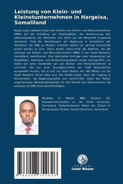 Regierungen weltweit haben den Einfluss von Kleinst- und Kleinunternehmen (KMU) auf die Schaffung von Arbeitsplätzen, die Verbesserung des Lebensstandards der Menschen und damit auf die Wirtschaft insgesamt anerkannt. Trotz der Bemühungen der Regierung in Somaliland, die Aktivitäten von KMU zu fördern, scheinen jedoch nur geringe Fortschritte erzielt worden zu sein. Diese Studie untersuchte die Faktoren, die die Leistung von Kleinst- und Kleinunternehmen (KMU) in der Stadt Hargeisa, Somaliland, beeinflussen. Eine deskriptive Umfrage unter Verwendung von Fragebögen, Interviews und Beobachtungsplänen wurde durchgeführt, um Daten von einer Stichprobe von 152 Kleinst- und Kleinunternehmen zu sammeln, die aus einer Grundgesamtheit von 1500 Unternehmen ausgewählt wurden, die in und um einen Radius von 400 Metern um die Stadt Hargeisa herum tätig sind. Die Studie ergab, dass der Zugang zu Finanzmitteln, die Regierungspolitik und -vorschriften sowie das Fehlen angemessener Marketingfähigkeiten für den Betrieb des Unternehmens die Leistung von KMU stark beeinträchtigten.