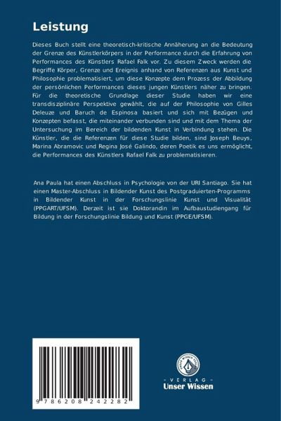 Dieses Buch stellt eine theoretisch-kritische Annäherung an die Bedeutung der Grenze des Künstlerkörpers in der Performance durch die Erfahrung von Performances des Künstlers Rafael Falk vor. Zu diesem Zweck werden die Begriffe Körper, Grenze und Ereignis anhand von Referenzen aus Kunst und Philosophie problematisiert, um diese Konzepte dem Prozess der Abbildung der persönlichen Performances dieses jungen Künstlers näher zu bringen. Für die theoretische Grundlage dieser Studie haben wir eine transdisziplinäre Perspektive gewählt, die auf der Philosophie von Gilles Deleuze und Baruch de Espinosa basiert und sich mit Bezügen und Konzepten befasst, die miteinander verbunden sind und mit dem Thema der Untersuchung im Bereich der bildenden Kunst in Verbindung stehen. Die Künstler, die die Referenzen für diese Studie bilden, sind Joseph Beuys, Marina Abramovic und Regina José Galindo, deren Poetik es uns ermöglicht, die Performances des Künstlers Rafael Falk zu problematisieren.