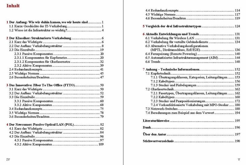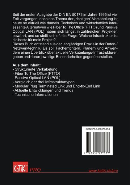 Seit der ersten Ausgabe der DIN EN 50173 im Jahre 1995 ist viel Zeit vergangen, doch das Thema der "richtigen" Verkabelung ist heute so aktuell wie damals. Technisch und wirtschaftlich interessante Alternativen wie Fiber To The Office (FTTO) und Passive Optical LAN (POL) haben sich längst in zahlreichen Projekten bewährt, und so stellt sich oft die Frage: Welche Infrastruktur ist die beste für mein Projekt? Dieses Buch entstand aus der langjährigen Praxis in der Daten-/Netzwerktechnik. Es soll Facherrichtern, Planern und Anwendern einen Überblick über aktuelle Verkabelungs-Infrastrukturen geben und deren jeweilige Besonderheiten gegenüberstellen. Aus dem Inhalt: - Strukturierte Verkabelung - Fiber To The Office (FTTO) - Passive Optical LAN (POL) - Vergleich der drei Infrastrukturtypen - Modular Plug Terminated Link und End to End Link - Aktuelle Entwicklungen und Trends - Technische Informationen