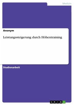 Studienarbeit aus dem Jahr 2013 im Fachbereich Medizin - Chirurgie, Unfallmedizin, Note: 1,0, Universität Koblenz-Landau (sportwissenschaft), Sprache: Deutsch, Abstract: Anlass zum Höhentraining waren die Olympischen Spiele 1968 in Mexico City in 2.240m Höhe, denn bei Ausdauersportarten über zwei Minuten wurde ein Leistungsrückgang von zwei bis acht Prozent festgestellt. Daher erkannte man, dass ein präventives Höhentraining eingesetzt werden muss um die Leistungsabnahme bei einem Wettkampf in der Höhe zu verhindern. Des Weiteren hat man festgestellt, dass solch ein Training aufgrund der Steigerung der sportlichen Ausdauerleistungsfähigkeit auch als Vorbereitung auf Leistungen im Flachland eingesetzt werden kann. Aufgrund des in der Höhe herrschenden Sauerstoffmangels und der damit verbundenen Verringerung der Sauerstoffaufnahmekapazität des Blutes erzwingt das Höhentraining physiologische Anpassungserscheinungen des gesamten Organismus. Da das Blut somit einen niedrigeren Sauerstoffgehalt hat, kann folglich nicht mehr so viel Sauerstoff zu den Muskeln transportieren werden. Der Körper versucht dies zu kompensieren, indem er beispielsweise ein Hormon (Erythropoetin) ausschüttet das dazu führt, dass vermehrt rote Blutkörperchen gebildet werden, welche für den Transport von Sauerstoff zuständig sind. Ein Höhentraining hat allerdings nicht nur positive Auswirkungen auf den Organismus, wodurch der Sportler bzw. sein Körper ständig versuchen muss die negativen Effekte auszugleichen. Ein Beispiel dafür ist die Abnahme des Wassergehaltes in der Höhe, denn dadurch steigt der Hämatokrit, weswegen die Vermehrung der roten Blutkörperchen dem Körper wiederum zum Verhängnis wird. Durch den erhöhten Hämatokrit wird das Blut nämlich dickflüssig, was Thrombosen oder sogar Herzinfarkte zur Folge haben kann. Um sich die erhöhte Anzahl der roten Blutkörperchen trotzdem vorteilhaft zu machen, muss der Sportler viel trinken. Das Höhentraining bringt noch viele weitere Trainingseffekte, wie die Steigerung des Atemminutenvolumens oder des Herzminutenvolumens mit sich. Solche physiologischen Wirksamkeiten können allerdings nur mit einem Training ab drei Wochen Dauer eintreten. Dabei ist es wichtig, dass man bestimmte trainingsmethodische Voraussetzungen beachtet, da diese die größte Bedeutung für den späteren sportlichen Erfolg haben. So muss man beispielsweise wissen, dass man in der Höhe zunächst die Belastungsintensität herunterschrauben muss, da es ansonsten zu einer erhöhten Laktatanhäufung kommt, die den Sportler folglich stark ermüden lässt.