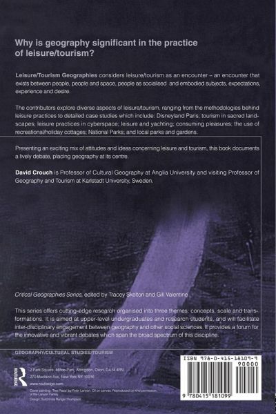 List if plates List if contributors Acknowledgements 1. Introduction: encounters in leisure/tourism 2. The mytho-poetic in northern travel 3. Sensing leisure spaces 4. Parks and gardens: metaphors for the modern places of sport 5. Heritage and nationalism: gender and the performance of power 6. Hyper-reality in the official (re)construction of leisure sites: the case of rambling 7. Narrativised spaces: the functions of story in the theme park 8. Cultural contestation at Disneyland Paris 9. Nomadic-symbolic and settler-consumer leisure practices in Poland 10. Tourism and sacred landscapes 11. Design versus leisure: social implications of functionalist design in urban private gardens of the twentieth century 12. Consuming pleasures: food leisure and the negotiation of sexual relations 13. Where you want to go today (like it or not): leisure practices in cyberspace 14. That sinking feeling: elitism working leisure and yachting 15. Leisure places and modernity: the use and meaning of recreational cottages in Norway and the USA 16. Leisure lots and summer cottages as places for people's own creative work 17. Knowing tourism and practices of vision 18. The intimacy and expansion of space 19. Knowledge by doing: home and identity in a bodily perspective Name index Subject index