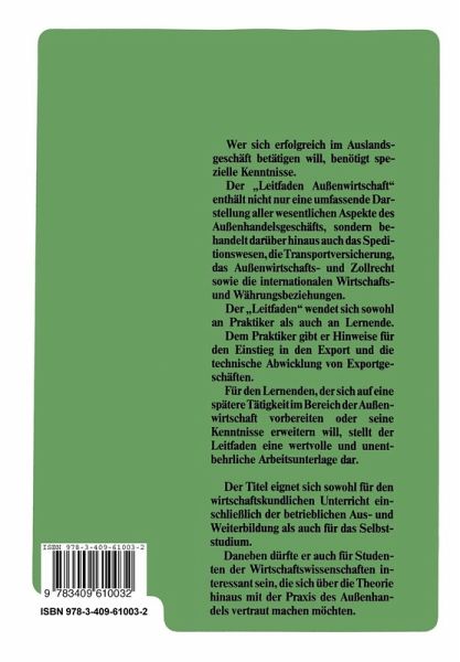 I. Allgemeine Übersicht.- 1. Definition des Begriffs "Außenwirtschaft".- 2. Außenhandel.- 3. Dienstleistungsverkehr.- 4. Kapitalverkehr.- II. Handels- und Zahlungsbilanz.- 1. Handelsbilanz.- 2. Zahlungsbilanz.- 3. Aufstellung der Zahlungsbilanz.- 4. Zahlungsbilanzgleichgewicht.- 5. Terms of trade.- III. Absatz- und Beschaffungsformen; Warenbörsen.- 1. Indirekter Export, Exporthändler und Exportvertreter.- 2. Direkter Export.- a) Exportabteilung.- b) Exportgemeinschaften.- c) Absatzmittler im Direktexport.- 3. Auslandsniederlassungen.- 4. Fertigung im Ausland.- a) Eigenfertigung.- b) Lizenzfertigung.- 5. Indirekter Import und Importhändler.- 6. Direkter Import.- 7. Makler.- 8. Auktionen.- 9. Warenbörsen.- IV. Marktforschung, Werbung; Messen und Ausstellungen.- 1. Markterkundung und Marktforschung.- 2. Auslandswerbung.- 3. Messen und Ausstellungen.- 4. AUMA.- V. Einrichtungen im Dienste der Außenwirtschaft.- A. In der Bundesrepublik.- 1. Bundesstelle für Außenhandelsinformation.- 2. Industrie-und Handelskammern.- 3. Ländervereine.- 4. Sonstige Einrichtungen.- B. Im Ausland.- 1. Die diplomatischen und konsularischen Auslandsvertretungen.- 2. Auslandshandelskammern.- 3. Die Internationale Handelskammer.- VI. Geschäftsanbahnung, Verträge, Beilegung von Streitigkeiten; Tauschhandel.- A. Geschäftsanbahnung.- 1. Anknüpfung von Kontakten.- 2. Einholung von Auskünften.- 3. Ausschreibungen.- B. Verträge.- 1. Vertragsabschlüsse mit ausländischen Partnern.- 2. Das anzuwendende Recht.- a) Das Internationale Privatrecht.- b) Internationales Kaufrecht.- 3. Gerichtsstand und Vollstreckung deutscher Gerichtsurteile im Ausland.- 4. Eigentumsvorbehalt.- 5. Haager Kaufrechtsübereinkommen.- C. Beilegung von Streitigkeiten.- 1. Möglichkeiten der Beilegung.- 2.Schiedsgericht der Internationalen Handelskammer.- 3. Weltbank-Schiedsgerichtskonvention.- D. Tauschhandel.- 1. Bedeutung des Tauschhandels.- 2. Arten von Tauschhandelsgeschäften.- VII. Lieferungsbedingungen.- 1. Bedeutung der Lieferungsbedingungen.- 2. Incoterms.- a) Incoterms 1980.- b) Wortlaut der CIF-Klausel.- 3. American Foreign Trade Definitions.- VIII. Verpackung und Markierung.- 1. Wahl der Verpackung.- 2. Seemäßige Verpackung.- 3. Innere und äußere Verpackung.- 4. Korrosionsschutz.- 5. Paletten und Container.- 6. Kollo-Markierung.- 7. Verpackungs-und Markierungsvorschriften.- IX. Dokumente (Warenbegleitpapiere).- 1. Arten von Dokumenten.- 2. Rechnungen.- 3. Ursprungs- und Präferenznachweise.- a) Ursprungsregeln.- b) Ursprungszeugnis.- c) Präferenznachweise.- 4. Sonstige Dokumente.- 5. Begleitpapiervorschriften und-Vordrucke.- X. Spedition, Lagerung und Transport.- 1. Speditionsgeschäft.- 2. Lagergeschäft.- 3. Eisenbahngüterverkehr.- 4. Güterkraftverkehr.- 5. Luftfrachtverkehr.- 6. Binnenschiffahrt.- 7. Seefrachtverkehr.- a) Linien- und Trampschiffahrt.- b) Seefrachtvertrag und Schiffsmiete.- c) Frachtpapiere und Frachtberechnung.- 8. Konnossement.- 9. Hamburger Regeln.- 10. Kombinierter Verkehr.- XI. Transportversicherung.- 1. Arten der Versicherung.- 2. Kaufvertrag und Versicherung.- 3. Versicherungsvertrag.- 4. Versicherungspolice und -Zertifikat.- 5. Havarie.- 6. Versicherungsbedingungen.- 7. Verfahren bei Seeschäden.- XII. Zahlungsbedingungen.- 1. Festsetzung der Zahlungsbedingungen.- 2. Nichtdokumentäre und dokumentäre Konditionen.- 3. Kasse gegen Dokumente.- 4. Dokumente gegen Akzept.- 5. Abwicklung von Dokumenteninkassi.- 6. Wechselrembours.- 7. Dokumentenakkreditiv.- a) Definition.- b) Widerrufliche und unwiderrufliche, bestätigte undunbestätigte Akkreditive.- c) Einlösung.- d) Vorteile und Risiken.- e) Sonderformen des Akkreditivs.- f) Einheitliche Richtlinien und Gebräuche für Dokumentenakkreditive.- g) Abwicklung eines unwiderruflichen und unbestätigten Dokumentenakkreditivs.- XIII. Forderungseinzug; Ausfuhrrisiken; Gewährleistungen des Bundes.- 1. Einziehung von Auslandsforderungen.- 2. Ausfuhrrisiken und Sicherungsmöglichkeiten.- 3. Gewährleistungen des Bundes.- a) Ausfuhrgarantien und-bürgschaften.- b) Fabrikationsrisikodeckung.- c) Ausfuhr-Pauschal-Gewährleistungen.- d) Wechselkursdeckung.- e) Bundesgarantien für Kapitalanlagen im Ausland.- XIV. Finanzierung.- 1. Arten der Finanzierung.- a) Exportfinanzierung.- b) Importfinanzierung.- 2. Forfaitierung.- 3. Factoringgesellschaften.- 4. Privatdiskont-AG.- 5. AKA Ausfuhrkredit-Gesellschaft mbH.- 6. Kreditanstalt für Wiederaufbau.- XV. Devisen und Devisenhandel; Euromärkte.- 1. Devisen, Sorten und Valuta.- 2. Freier Devisenhandel und Devisenbewirtschaftung.- 3. Der Devisenhandel in der Bundesrepublik.- 4. Kursrisiko und Kurssicherung.- 5. Swapgeschäfte.- 6. Devisenarbitrage.- 7. Euromarkt.- XVI. Währungssysteme und internationale Währungsordnung.- 1. Währungssysteme.- 2. Außenwert.- 3. System von Bretton Woods.- 4. Änderungen seit Bretton Woods.- a) Sonderziehungsrechte.- b) Wechselkurssystem.- c) Gold.- d) Kreditfazilitäten.- 5. Der Europäische Währungsverbund.- 6. Das Europäische Währungssystem.- XVII. Außenwirtschaftspolitik.- 1. Freihandel, Protektionismus und Autarkiepolitik.- 2. Staatliche Ausfuhrpolitik.- 3. Dumping.- 4. Staatliche Einfuhrpolitik.- 5. Einfuhrzölle.- 6. Mengenmäßige Beschränkungen und Selbstbeschränkungsabkommen.- 7. Andere nichttarifäre Handelshemmnisse.- 8. StaatlichesAußenhandelsmonopol.- XVIII. Außenwirtschaftsrecht.- 1. Außenwirtschaftsgesetz und Außenwirtschaftsverordnung.- 2. Ausfuhrvorschriften.- 3. Ausfuhrverfahren.- a) Genehmigungsfreie Ausfuhr.- b) Genehmigungsbedürftige Ausfuhr.- c) Befreiungen bei der Ausfuhr.- 4. Einfuhrvorschriften.- 5. Einfuhrverfahren.- a) Genehmigungsfreie Einfuhr.- b) Genehmigungsbedürftige Einfuhr.- c) Erleichtertes Verfahren bei der Einfuhr.- 6. Vorschriften für Transithandelsgeschäfte.- 7. Vorschriften für den Dienstleistungsverkehr.- 8. Vorschriften für den Geld- und Kapitalverkehr.- XIX. Zölle und Steuern.- A. Zollwesen.- 1. Zollverwaltung.- 2. Z