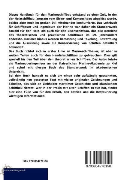 Bei dem Buch handelt es sich um einen sehr aufwändig gescannten, vollständig neu gesetzten Text mit vielen originalen Zeichnungen und Tabellen, das sich an Liebhaber maritimer Geschichte und klassischem Schiffbau richtet. Wer in der Praxis mit alten Schiffen zu tun hat, findet hier eine Fülle von für den Erhalt, den Betrieb und die Restaurierung wichtigen Informationen.