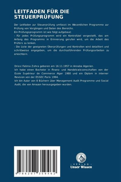 Der Leitfaden zur Steuerprüfung umfasst im Wesentlichen Programme zur Prüfung von Vorgängen und Daten des Bereichs.Ein Prüfungsprogramm ist wie folgt aufgebaut:- Für jedes Prüfungsprogramm wird ein Kontrollziel vorgestellt, das am Anfang des Programms in Erinnerung gerufen wird, um die Arbeit des Prüfers zu lenken.- Die Liste der geeigneten Überprüfungen und Kontrollen wird detailliert und schrittweise angegeben, um die durchzuführenden Prüfungsarbeiten zu erleichtern.