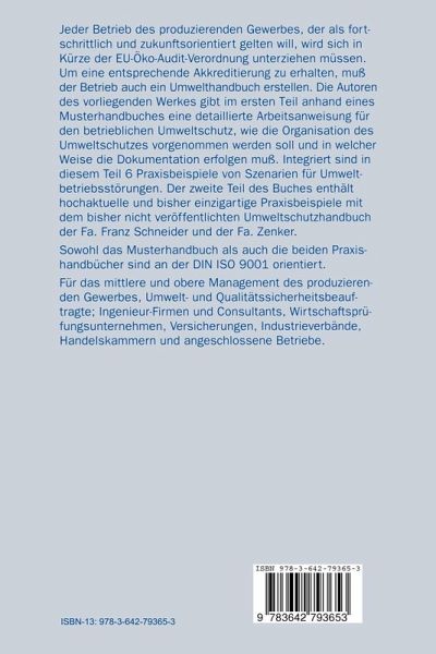 Gliederung des Umwelthandbuches.- Erstellung eines Umwelthandbuches am Beispiel der fiktiven Muster AG .- Darstellung der für die Muster AG relevanten umweltschutzrechtlichen Grundlagen.- Umweltschutzhandbuch des Unternehmens Franz Schneider Brakel GmbH & Co., Brakel.- Handbuch Umweltschutz, zenker-Fenster GmbH & Co kg, Höxter-Lüchtringen.- Stichwortverzeichnis.