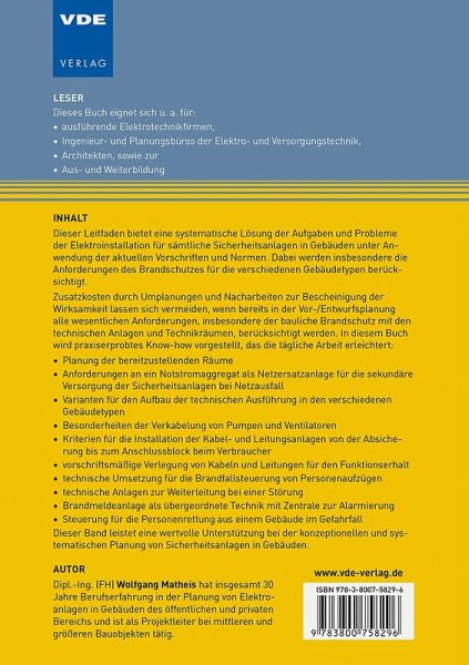 Dieser Leitfaden bietet eine systematische Lösung der Aufgaben und Probleme der Elektroinstallation für sämtliche Sicherheitsanlagen in Gebäuden unter Anwendung der aktuellen Vorschriften und Normen. Dabei werden insbesondere die Anforderungen des Brandschutzes für die verschiedenen Gebäudetypen berücksichtigt.Zusatzkosten durch Umplanungen und Nacharbeiten zur Bescheinigung der Wirksamkeit lassen sich vermeiden, wenn bereits in der Vor-/Entwurfsplanung alle wesentlichen Anforderungen, insbesondere der bauliche Brandschutz mit den technischen Anlagen und Technikräumen, berücksichtigt werden. In diesem Buch wird praxiserprobtes Know-how vorgestellt, das die tägliche Arbeit erleichtert:- Planung der bereitzustellenden Räume- Anforderungen an ein Notstromaggregat als Netzersatzanlage für die sekundäre Versorgung der Sicherheitsanlagen bei Netzausfall- Varianten für den Aufbau der technischen Ausführung in den verschiedenen Gebäudetypen- Besonderheiten der Verkabelung von Pumpen und Ventilatoren- Kriterien für die Installation der Kabel- und Leitungsanlagen von der Absicherung bis zum Anschlussblock beim Verbraucher- vorschriftsmäßige Verlegung von Kabeln und Leitungen für den Funktionserhalt- technische Umsetzung für die Brandfallsteuerung von Personenaufzügen- technische Anlagen zur Weiterleitung bei einer Störung- Brandmeldeanlage als übergeordnete Technik mit Zentrale zur Alarmierung- Steuerung für die Personenrettung aus einem Gebäude im GefahrfallDieser Band leistet eine wertvolle Unterstützung bei der konzeptionellen und systematischen Planung von Sicherheitsanlagen in Gebäuden.