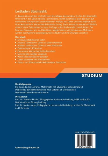 In dem Buch werden die fachlichen Grundlagen beschrieben werden, die für den Stochastik-Unterricht in der Sekundarstufe I zentral sind. Damit beschränkt sich das Buch auf elementare Konzepte der beschreibenden Analyse von Daten und wird ergänzt durch Grundkonzepte der Wahrscheinlichkeitsrechnung. Diese Konzepte werden ausführlich anhand eines Datensatzes zu einer Umfrage unter Studierenden beschrieben. Der Sinn der Konzepte, Vor- und Nachteile, Möglichkeiten und Grenzen von Methoden werden durchgehend beispielgebunden erläutert und mit Übungen versehen.