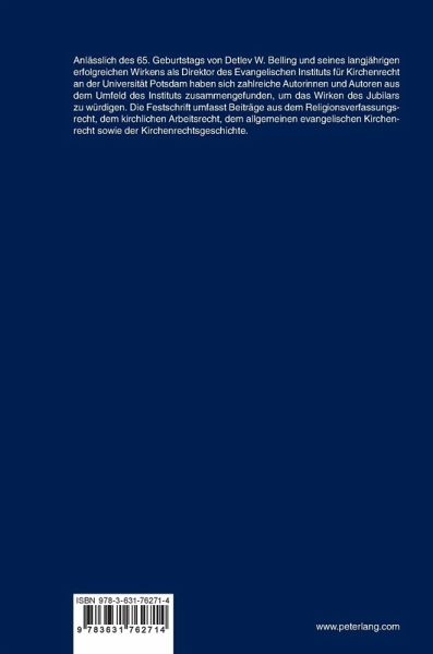 Anlässlich des 65. Geburtstags von Detlev W. Belling und seines langjährigen erfolgreichen Wirkens als Direktor des Evangelischen Instituts für Kirchenrecht an der Universität Potsdam haben sich zahlreiche Autorinnen und Autoren aus dem Umfeld des Instituts zusammengefunden, um das Wirken des Jubilars zu würdigen. Die Festschrift umfasst Beiträge aus dem Religionsverfassungsrecht, dem kirchlichen Arbeitsrecht, dem allgemeinen evangelischen Kirchenrecht sowie der Kirchenrechtsgeschichte.