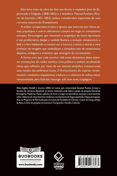 Este livro trata da obra de dois escritores: o espanhol José de Espronceda y Delgado (1808-1842) e o brasileiro Manuel Antônio Álvares de Azevedo (1831-1852), ambos considerados expoentes de uma corrente noturna do Romantismo. A análise comparativa mostra o apreço que nutriram por obras, temas, arquétipos e outros elementos comuns em voga no romantismo europeu. Personagens que retomam o arquétipo do herói byroniano e sua problemática psique, a vaidade fáustica, a sedução donjuanesca, a bela e a fera habitando o mesmo ser, a loucura, o amor, a morte e uma profusão de imagens que simbolizam a complexa teia de sentimentos díspares, ambíguos e violentos que emergem do inconsciente. A forma com que cada escritor relê esses elementos deixa entrever motivações de cunho estético e/ou político e acabam produzindo obras que remetem, por meio de um sistema simbólico transnacional, uma revisão das polêmicas locais. O florescimento do espírito revolucionário romântico impulsionou a leitura e a releitura de velhos mitos renascentistas para fazê-los ressurgir sob uma nova roupagem.