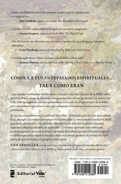 ¿Qué pueden revelar los hombres y mujeres más imperfectos de la Biblia sobre quién es Dios y cómo se comunica con usted y conmigo? La exitosa autora Ann Spangler nos lleva más allá de la imagen estereotipada de treinta y ocho personajes bíblicos, para presentarlos como personas reales que tenían sueños, tentaciones y debilidades al igual que nosotros. Ya sea considerando a la asesina Herodías, al conspirador Jacob o a la dudosa Sara, Spangler se acerca tanto a los personajes más famosos como a los menos conocidos, con una mirada distinta. Nos encontramos nuevamente con cada una de estas personas como si fuera la primera vez, dado que la autora ofrece una nueva versión dramática de sus vidas, una visión del contexto histórico y cultural de su tiempo, y enseñanzas clave para nuestra vida en la actualidad. Cada capítulo incluye preguntas para el debate o reflexión, lo que hace que este material sea ideal para el estudio bíblico individual o grupal. Entretenido, informativo e inspirador, este libro ofrece una visión general de la Biblia, incluso cuando lo conduce a ver los corazones y las mentes de gente con luchas como la suya. A medida que aprende más sobre los individuos que forman parte de su árbol genealógico espiritual, descubrirá por qué a Dios le encanta usar personas imperfectas para contar su historia perfecta de redención.