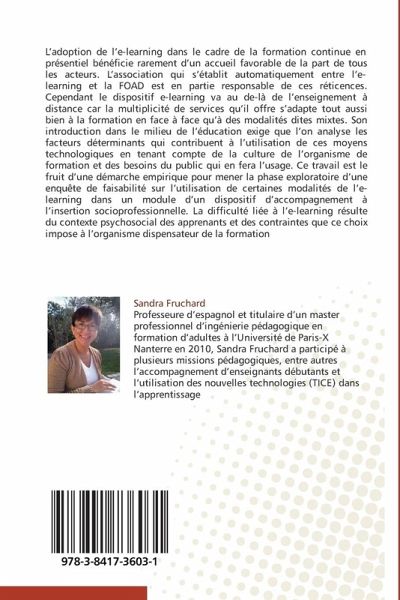 L'adoption de l'e-learning dans le cadre de la formation continue en présentiel bénéficie rarement d'un accueil favorable de la part de tous les acteurs. L'association qui s'établit automatiquement entre l'e-learning et la FOAD est en partie responsable de ces réticences. Cependant le dispositif e-learning va au de-là de l'enseignement à distance car la multiplicité de services qu'il offre s'adapte tout aussi bien à la formation en face à face qu'à des modalités dites mixtes. Son introduction dans le milieu de l'éducation exige que l'on analyse les facteurs déterminants qui contribuent à l'utilisation de ces moyens technologiques en tenant compte de la culture de l'organisme de formation et des besoins du public qui en fera l'usage. Ce travail est le fruit d'une démarche empirique pour mener la phase exploratoire d'une enquête de faisabilité sur l'utilisation de certaines modalités de l'e-learning dans un module d'un dispositif d'accompagnement à l'insertion socioprofessionnelle. La difficulté liée à l'e-learning résulte du contexte psychosocial des apprenants et des contraintes que ce choix impose à l'organisme dispensateur de la formation.